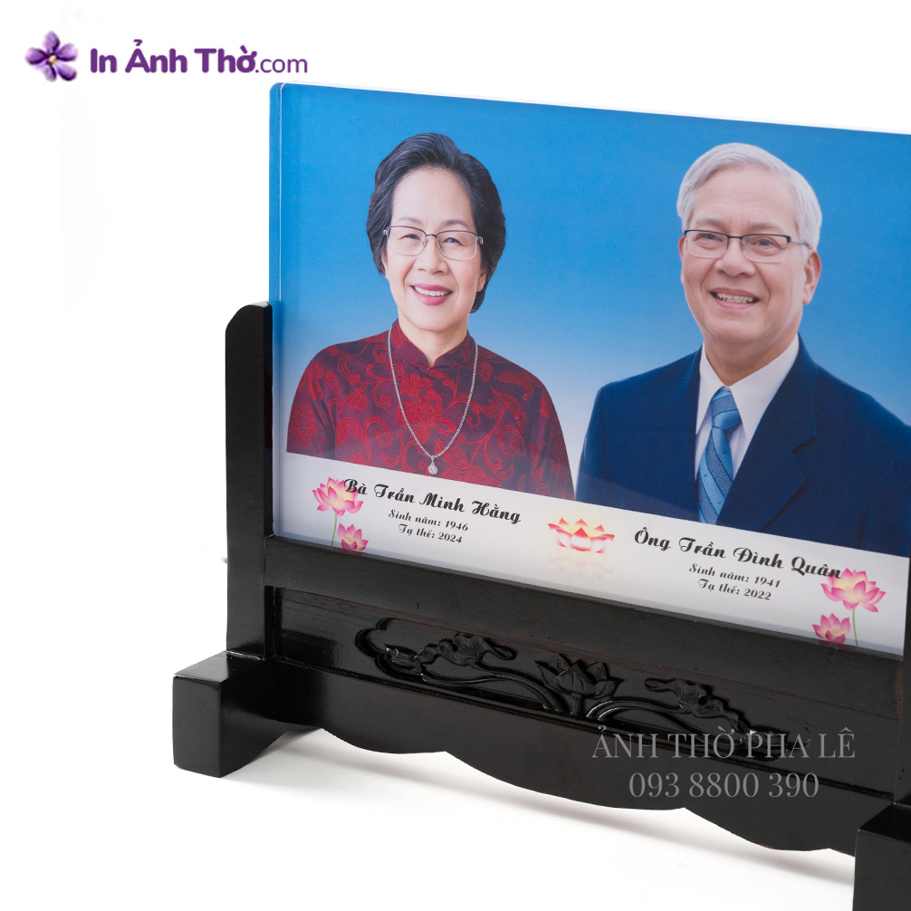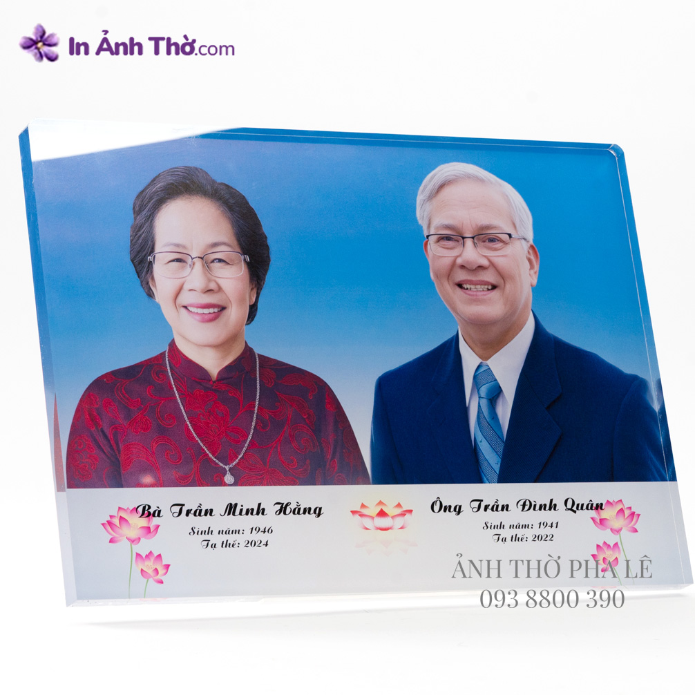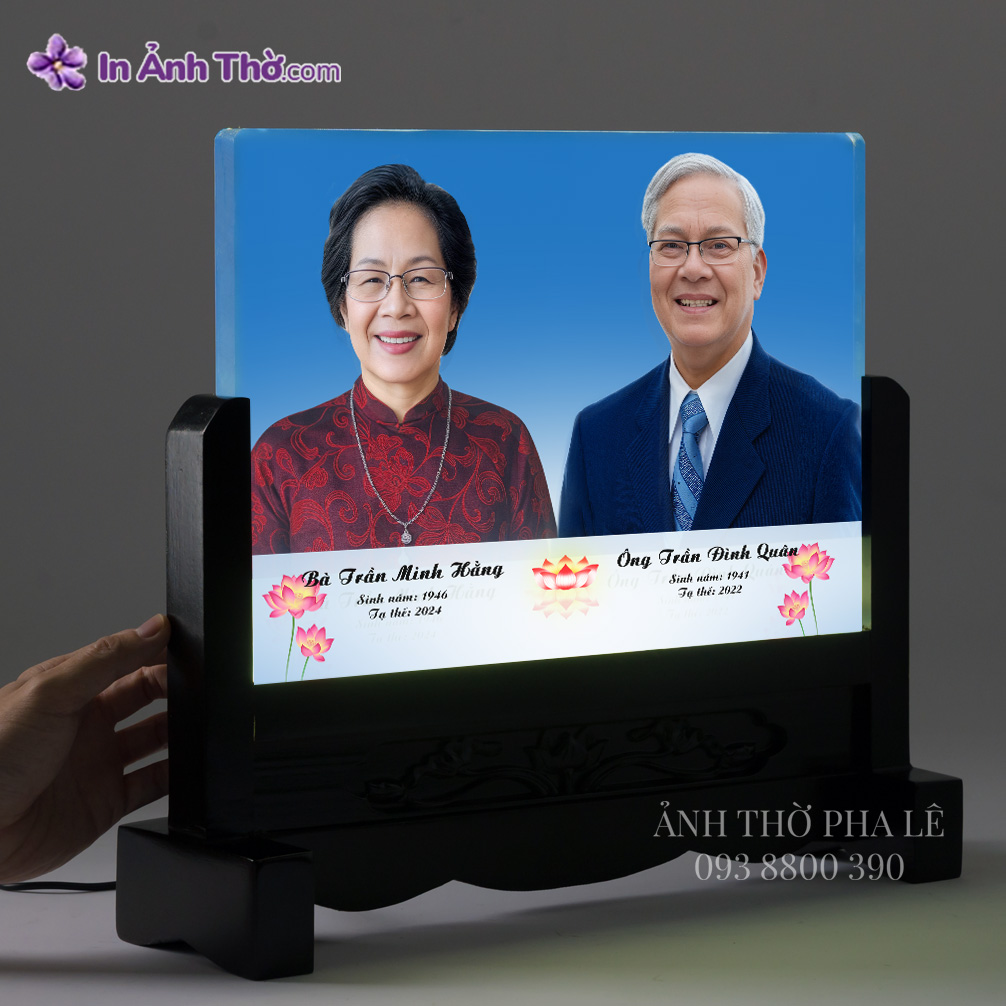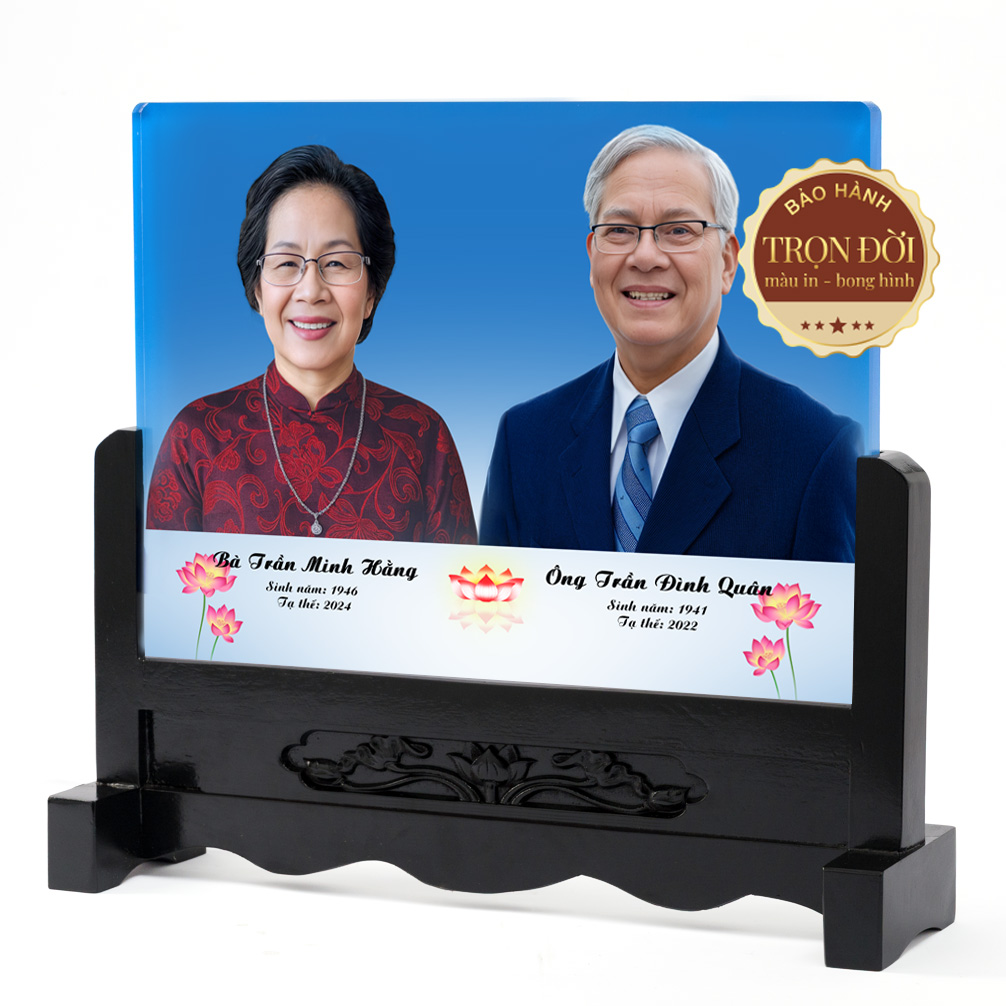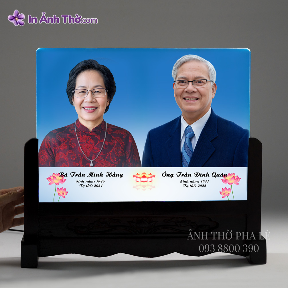 • Ảnh thờ pha lê đôi vợ chồng, thiết kế nền xanh trang trọng, in màu sắc nét trên chất liệu pha lê cao cấp, kết hợp đế gỗ chạm hoa truyền thống.